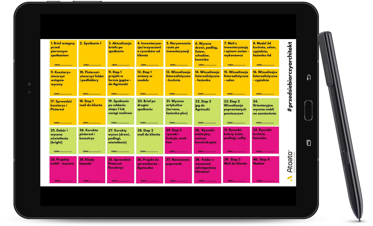 Dużo osób czuje opory przed dodaniem do listy swoich zadań jeszcze planera etapów projektowania wnętrz, ale to właśnie dzięki niemu zaczniesz uświadamiać sobie, ile tak naprawdę czasu potrzebujesz na dany etap projektowy.